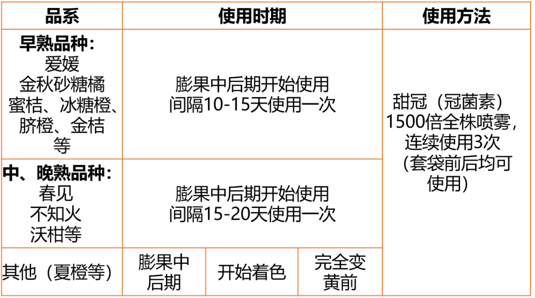 甜冠(冠菌素)適用于各類柑橘品種,如愛媛、金秋砂糖橘、砂糖橘、冰糖橙、金桔、沃柑、耙耙柑、不知火等。促進果實轉色、顏色紅潤,表皮靚麗,提升干物質積累,如提升糖度、芳香味物質積累,提高果實品質,提前上市,提升抗逆性,延長果實留樹保鮮和果實貨架期,減少流通環節損耗。